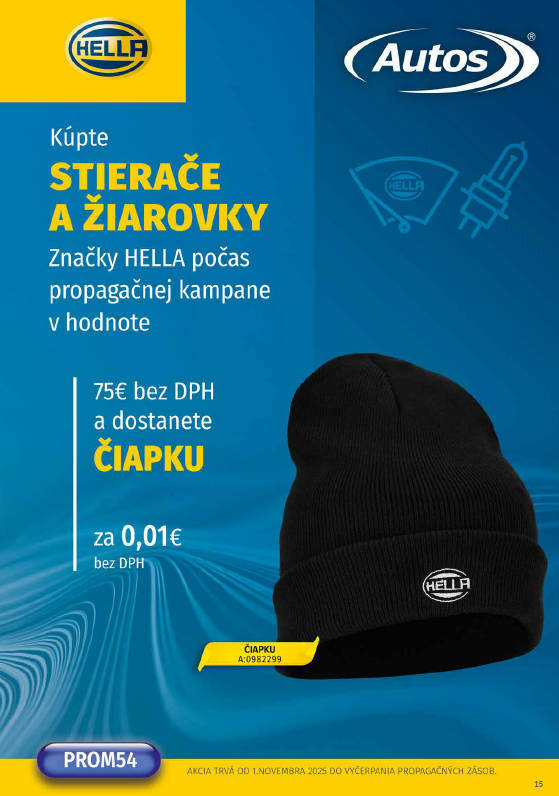 Kúpte stierače a žiarovky značky HELLA počas trvania propagačnej kampane v hodnote 75€ bez DPH a dostanete ČIAPKU za 0,01 bez DPH